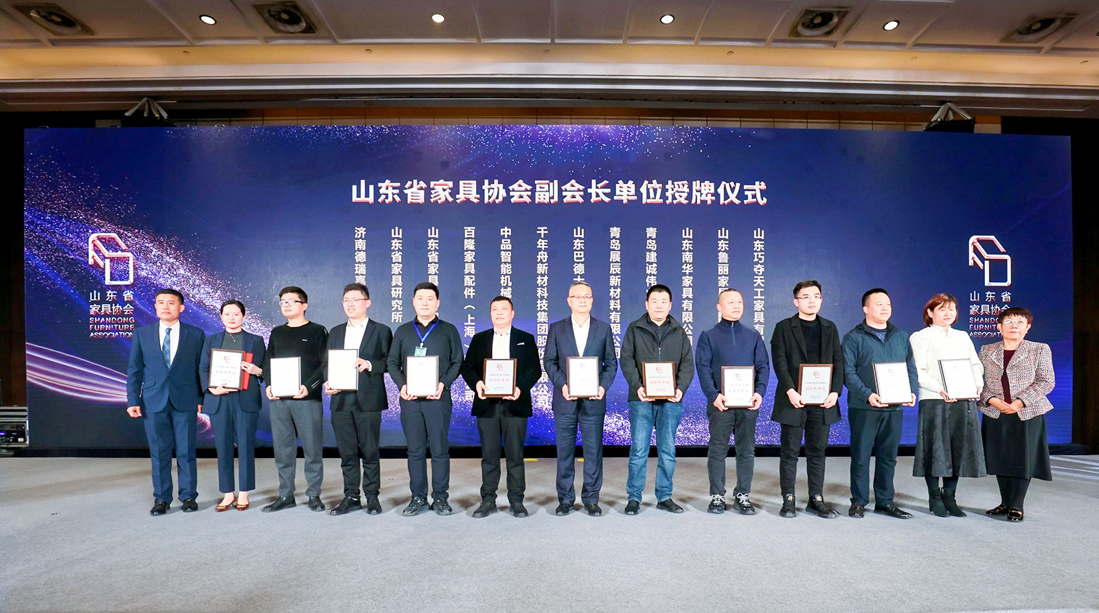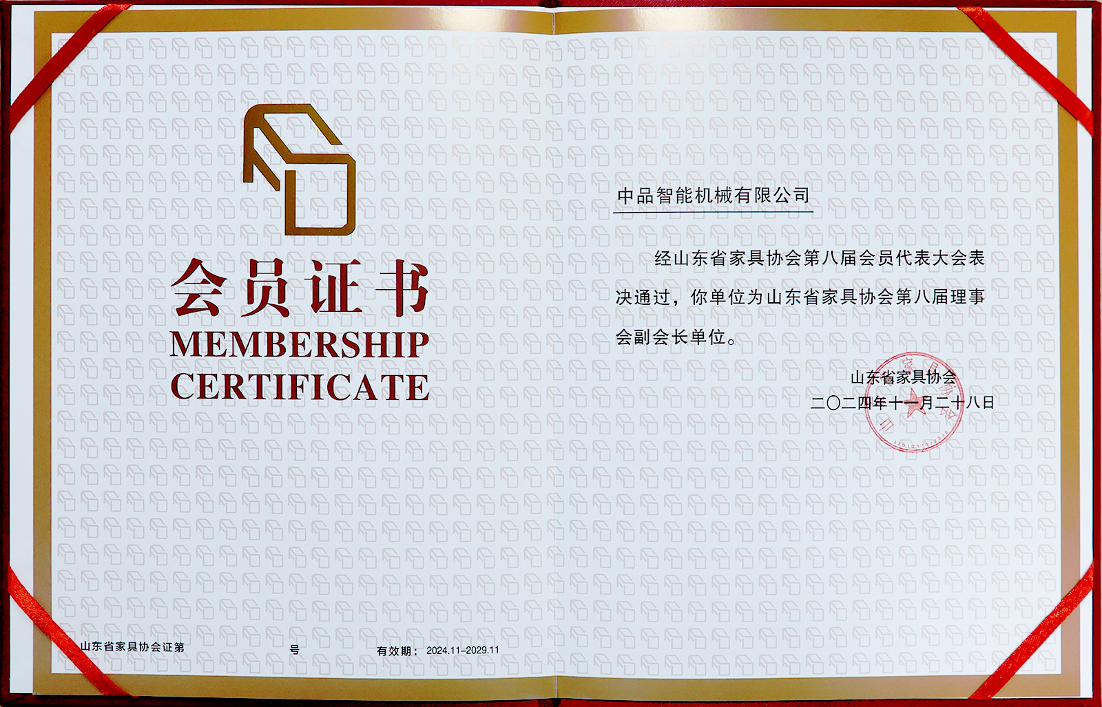 2024年11月28日山東省家具協會第八屆一次理事擴大會議在濟南舉行。經代表大會表決,中品智能機械有限公司當選為山東家具協會副會長單位。